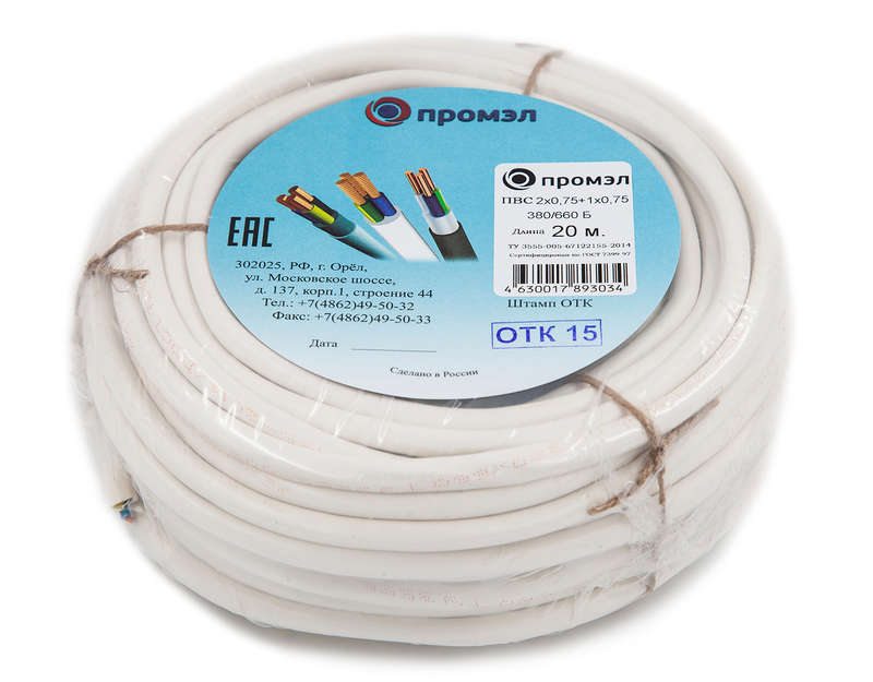 Провод ПВС 3х0.75 (2х0.75+1х0.75) 380В Б (бухта 20м) (шт) ПромЭл 13321580