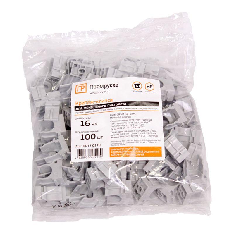 Держатель для труб (клипса) d16мм для монтажн. пистолета сер. в п/э Промрукав PR13.0119