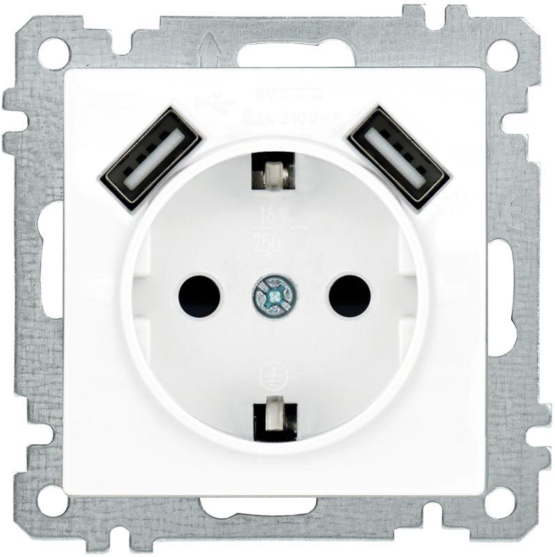 Механизм розетки 1-м СП Bolero Рюш10-1-Б 16А IP20 с заземл. защ. шторки с 2-мя заряд. устройствами USB 2.1А бел. IEK ERB14-K01-16-U2