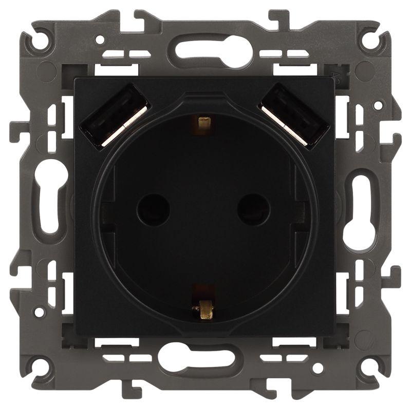 Розетка 16А 250В 2P+E с 2хUSB 5В-3А защ. шторки Elegance антрацит 14-4109-05 ЭРА Б0047871