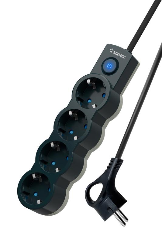 Удлинитель 4х5м с заземл. 10А IP20 2200Вт 220В защ. шторки ПВС 3х1 с выкл. черн. КОСМОС YKsm5m-4g-Z-V10A-B