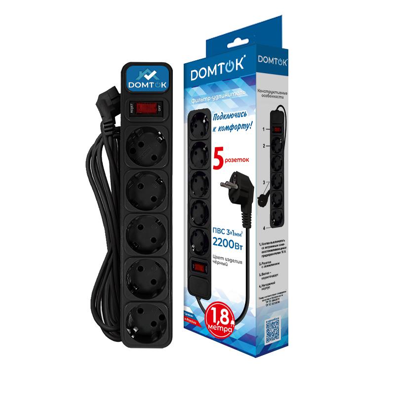 Удлинитель с сетевым фильтром 5х1.8м с заземл 10А IP20 2.2кВт ПВС 3х1 с выкл. черн. DOMTOK 2537