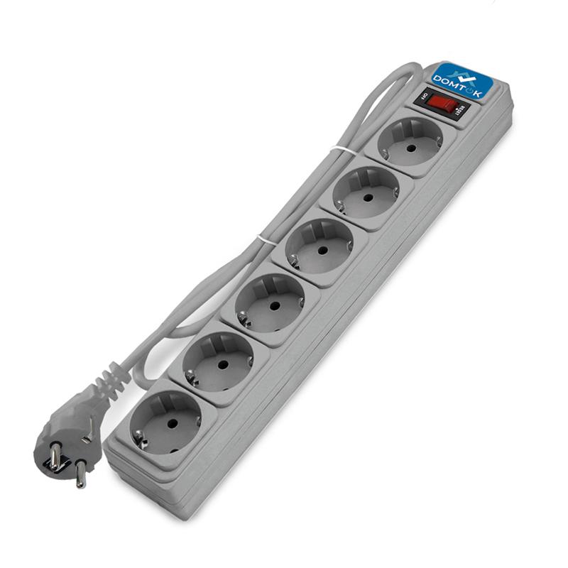 Удлинитель с сетевым фильтром 6х5м с заземл 10А IP20 2.2кВт ПВС 3х1 с выкл. сер. DOMTOK 2520