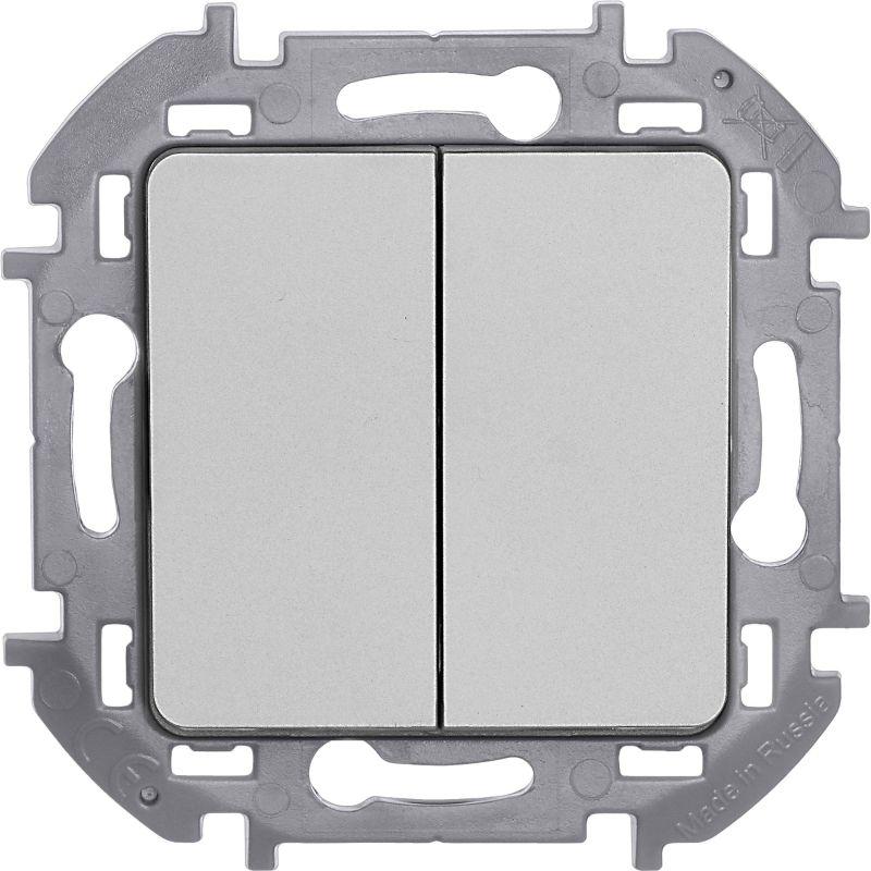 Выключатель двухклавишный скрытого монтажа Inspiria, цвет "Алюминий", номинальный ток 10АХ, напряжение ~250В, безвинтовые зажимы. Устанавливается в жилых и общественных помещениях для управления приборами освещения, вентиляции и т.д. Предназначен для управления двумя электрическими цепями.