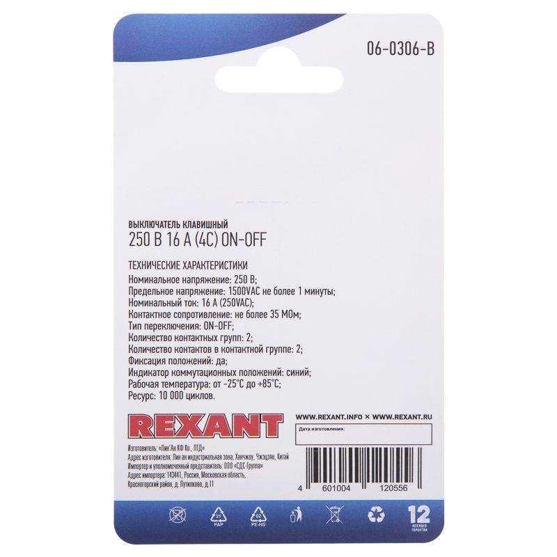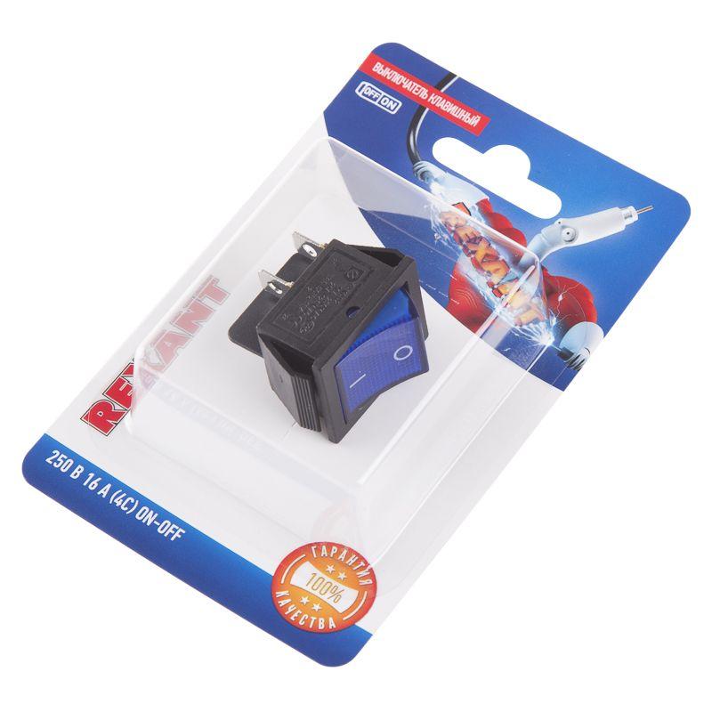 Выключатель клавишный 250В 16А (4с) ON-OFF син. с подсветкой (RWB-502 SC-767 IRS-201-1) блист. Rexant 06-0306-B