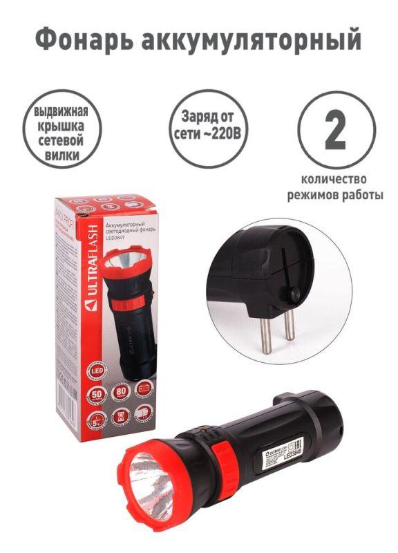 Фонарь аккумуляторный LED3849 1 LED 2 режима 220В аккум. SLA пластик черн. Ultraflash 14931