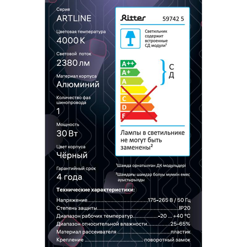 Светильник трековый светодиодный ARTLINE поворотный 80х80х170мм 30Вт 2380Лм 4000К 230В алюм. 15.5кв.м черн. Ritter 59742 5