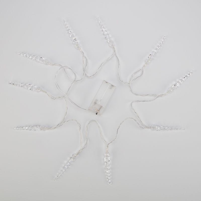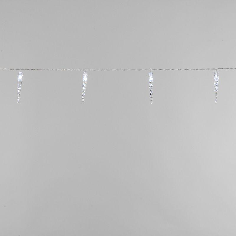 Светодиодная гирлянда «Сосульки» длиной 1,5 метра украшена пластиковыми насадками в виде ледяных сосулек, которые ярко подсвечиваются диодами. Украшение способствует созданию магической атмосферы праздника и помогает эффектно оформить интерьер. 10 сосулек расположены на расстоянии 16 сантиметров друг от друга, в качестве основы используется электрический кабель в надежной изоляции из прозрачного ПВХ. Диоды белого свечения питаются от двух батареек АА, которые помещаются в небольшой блок на конце кабеля. Безопасное изделие на батарейках — прекрасный вариант для оформления детской комнаты.