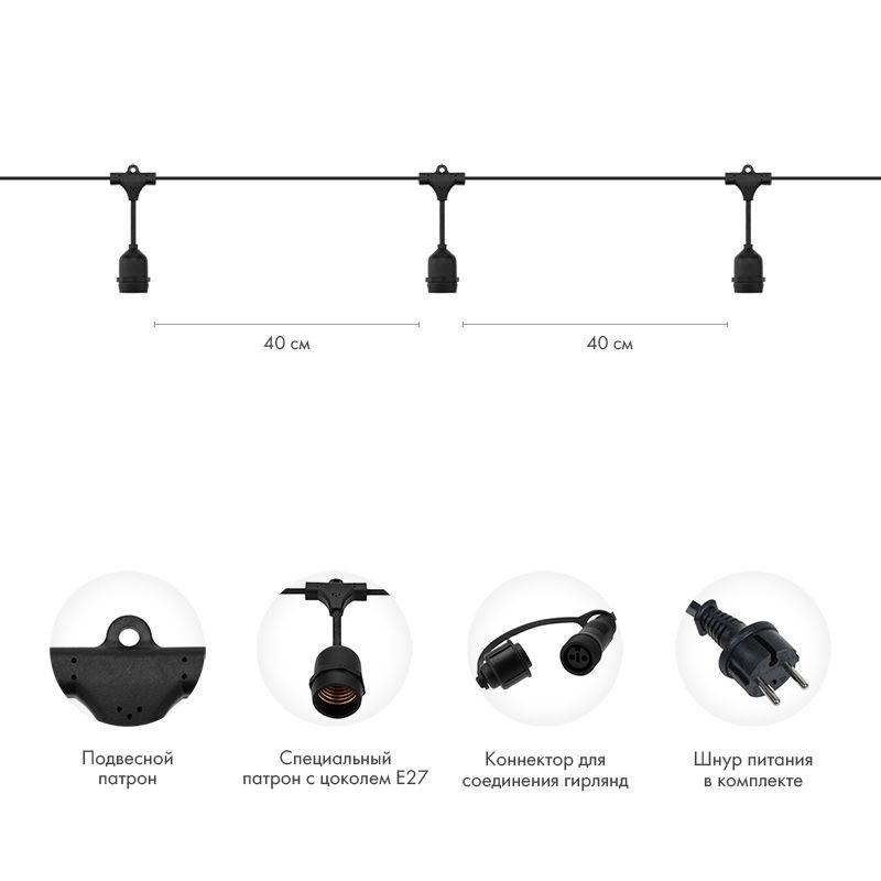Гирлянда представляет собой морозостойкий двухжильный провод из каучука (резины), на котором расположены резиновые патроны с цоколем Е27, свисающие на расстоянии 5 см от основной шины.