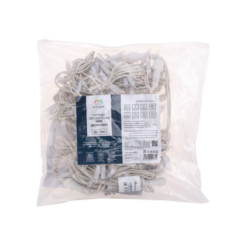 Гирлянда светодиодная "Нить" 20м 200LED бел. 18Вт 230В IP67 постоян. свечение провод каучук бел. (нужен шнур питания 315-001) Neon-Night 315-145