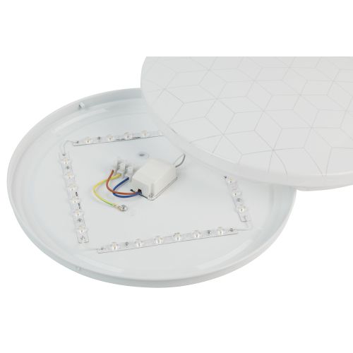 Компактные размеры 325?55 мм позволяют устанавливать светильник даже в помещениях с низкими потолками. Степень защиты IP20 делает его идеальным для сухих интерьеров. Геометрический узор на плафоне мягко подсвечивается при включении, создавая лёгкий декоративный эффект.