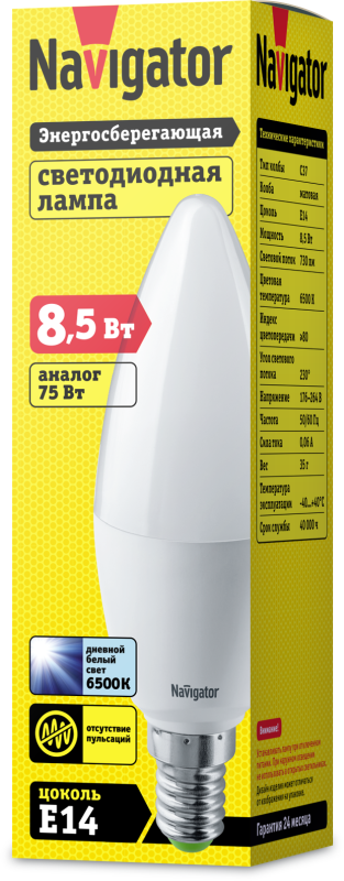 Лампа светодиодная 61 326 NLL-C37-8.5-230-6.5K-E14-FR 8.5Вт свеча матовая 6500К холод. бел. E14 730лм 176-264В Navigator 61326