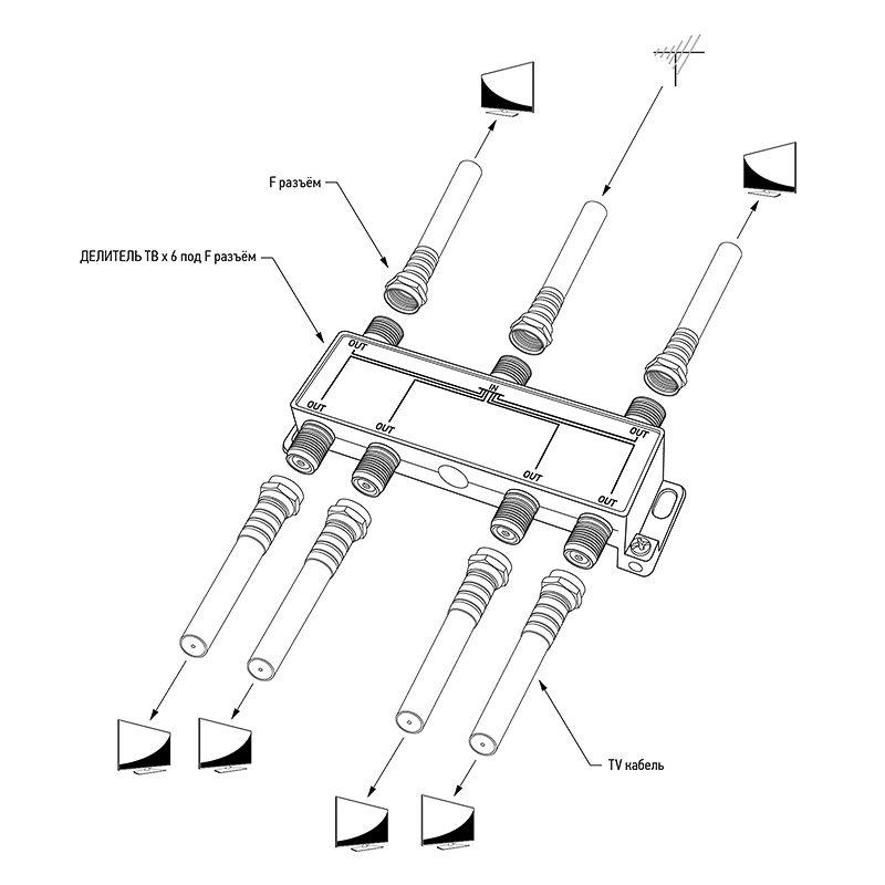 Сигнал, подающийся на вход, делится на шесть равных частей и передается на выходы. Для подключения кабелей используются стандартные F-разъемы.