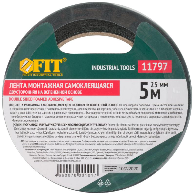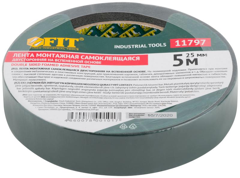 Лента клеящая 2-х сторонняя монтажная на вспененной основе с полимерной подложкой 25ммх5м FIT 11797