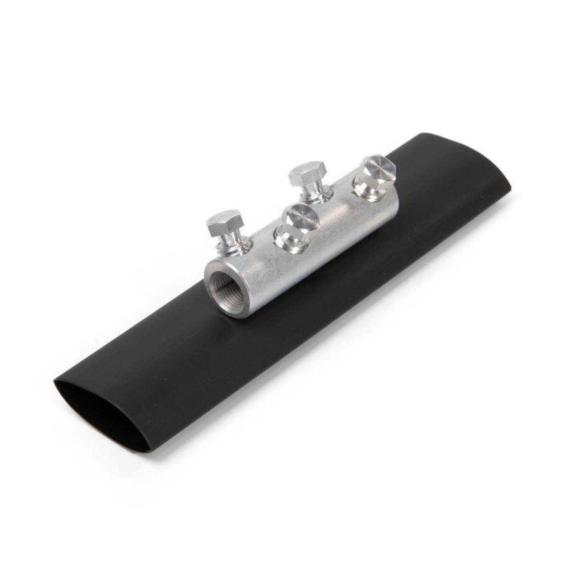 • Комплект состоит из болтового соединителя с угловым расположением болтов и термоусаживаемой манжеты с клеевым слоем