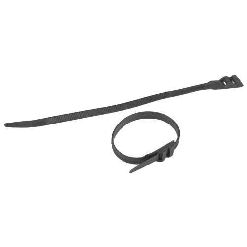Двойной горизонтальный замок в конструкции хомута обеспечивает надежную фиксацию и экономит пространство. Зубцы в механизме и по всей длине ленты ориентированы в противоположных направлениях, что предотвращает случайное выскальзывание ленты из паза.
