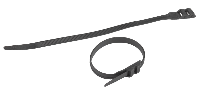 Двойной горизонтальный замок в конструкции хомута обеспечивает надежную фиксацию и экономит пространство. Зубцы в механизме и по всей длине ленты ориентированы в противоположных направлениях, что предотвращает случайное выскальзывание ленты из паза.
