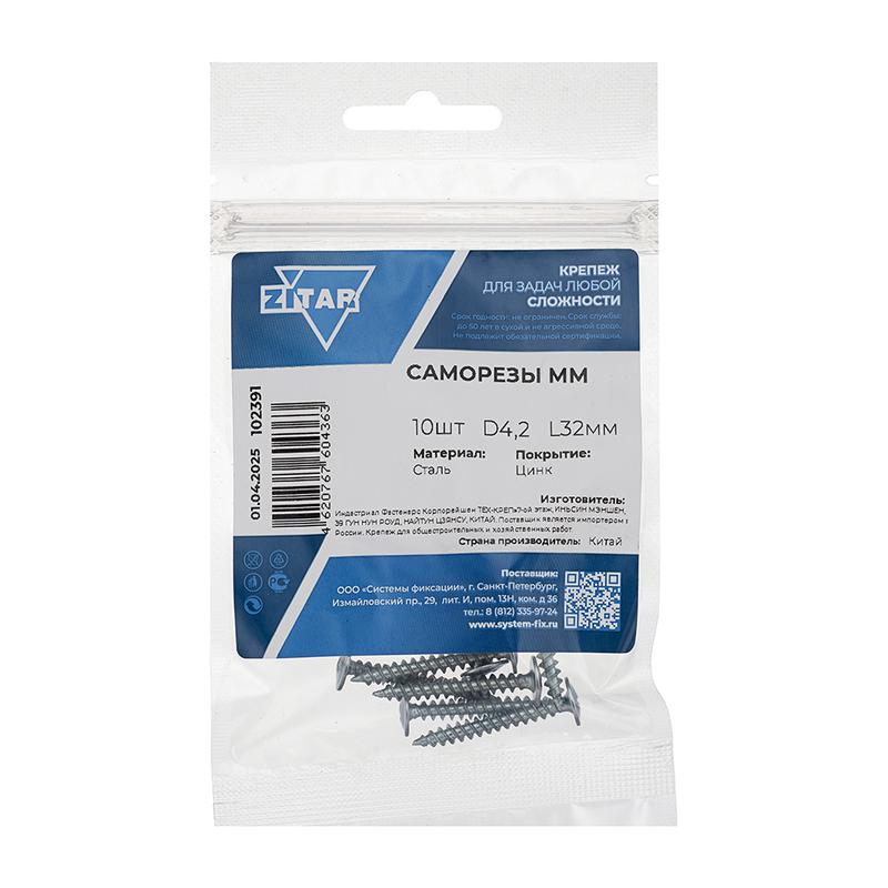 Саморез усиленный для тонкого метал. листа 4.2х32 (пакет) (уп.10шт) Zitar 102391