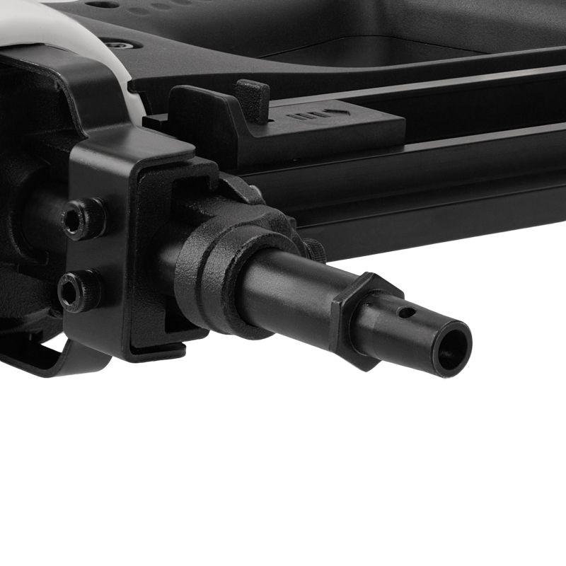 Инструмент обладает силой удара в 100 Дж, что позволяет забивать гвозди длиной от 15 до 40 мм и диаметром от 2,7 до 3,05 мм. Емкость магазина – 30 гвоздей. Одного газового баллона хватает на 1100 гвоздей. Длина баллона без учета пластикового клапана 165 мм.