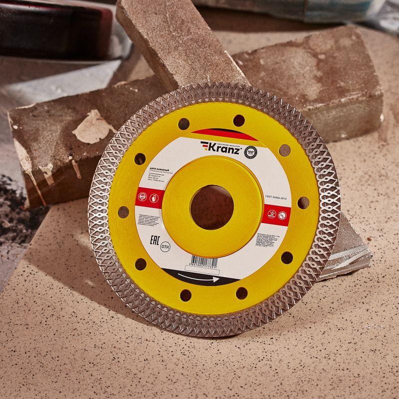 Диск алмазный отрезной ультратонкий предназначен для использования с угловыми шлифовальными машинами (УШМ) и ручными электрическими плиткорезами. Применяется для сухой и мокрой резки строительных материалов, таких как гранит, керамогранит, песчаник, клинкер, мрамор, керамика. Диск изготовлен из инструментальной стали и обладает ультратонким лезвием, покрытым синтетическим алмазом с высотой кромки 10 мм, что обеспечивает точную и чистую резку и долгий срок службы самого диска. Процесс резки сопровождается воздушным охлаждением за счет особой формы алмазного слоя. Это позволяет пилить без водяного охлаждения. Срок годности не ограничен. Хранить в сухом прохладном месте. Использовать строго по назначению. Внимание! Запрещается использовать диск для разрезания металлов. При установке диска руководствуйтесь стрелкой направления вращения диска. Используйте средства индивидуальной защиты. Не утилизируйте с бытовыми отходами.