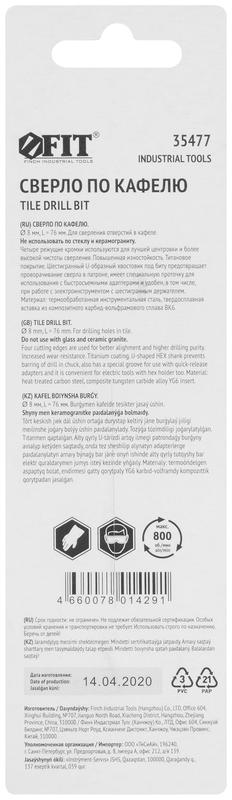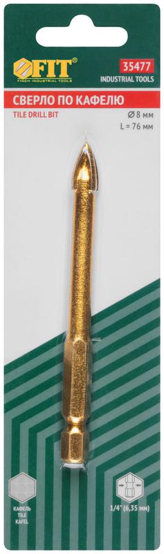 Сверло по кафелю 4 режущие кромки титан. покрытие U-хвостовик под биту 8х76мм FIT 35477