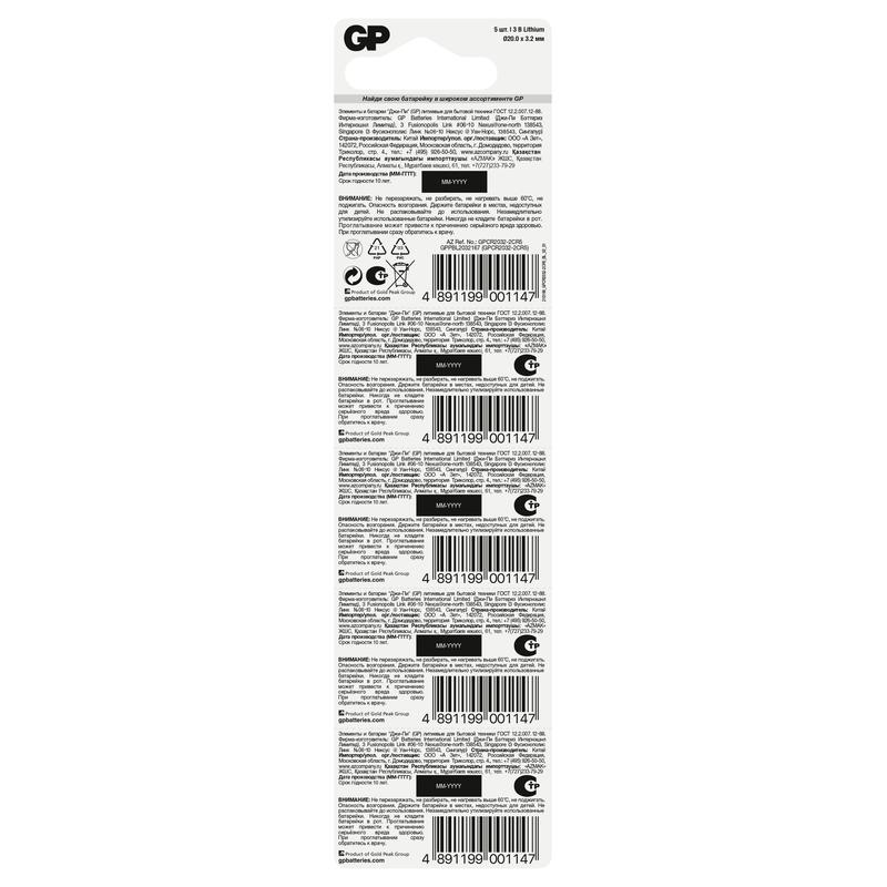Элемент питания литиевый CR2032 CR2032-2C5 100/2000 (блист.5шт) GP 9036