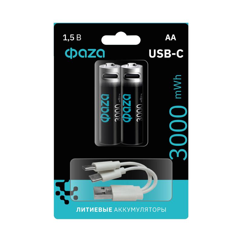 Аккумулятор литиевый AA 1.5В Li-Ion 3000мВт.ч 2000мА.ч зарядка от Type-C шнур в комплекте BL-2 (уп.2шт) ФАZА 5061576