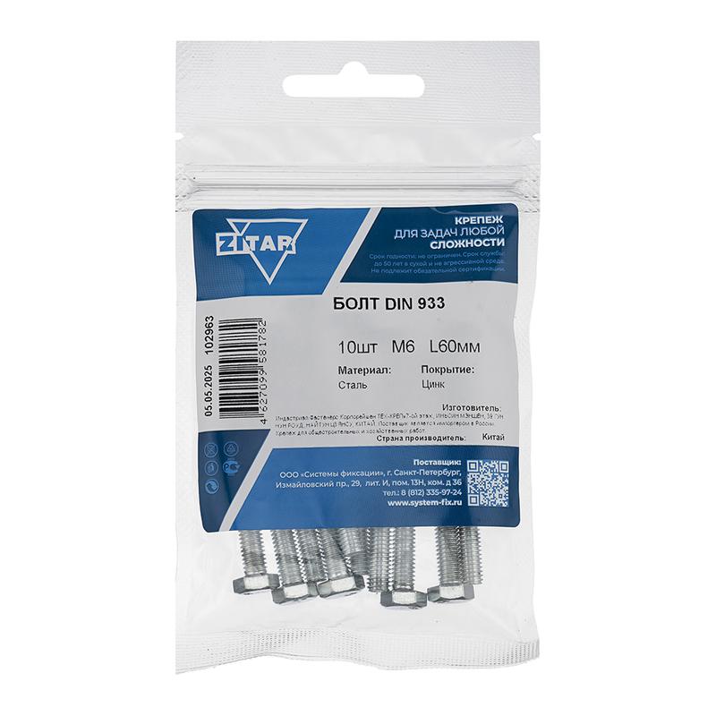 Болт с шестигранной головкой М6х60 DIN 933 оцинк. (уп.10шт) Zitar 102963