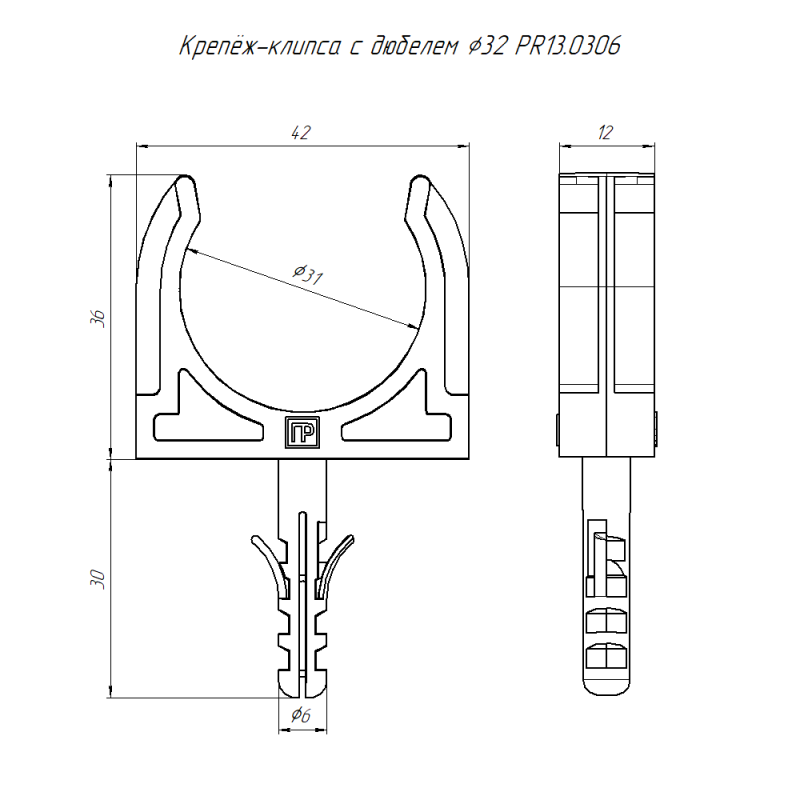 Держатель для труб (клипса) d32мм с дюбелем черн. (в малой упак.) (уп.10шт) Промрукав PR13.0306