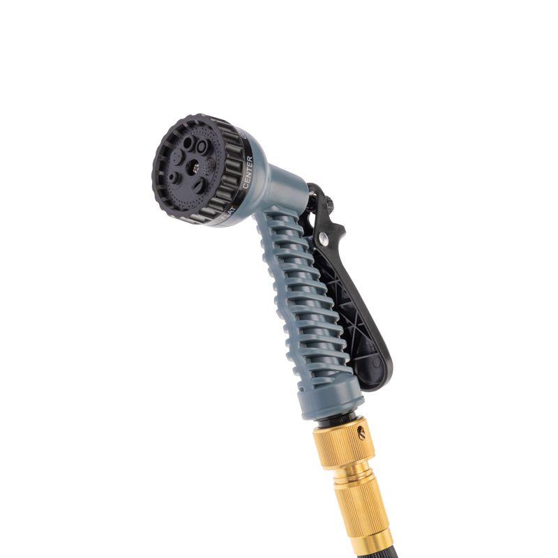 Пистолет-распылитель оснащен эргономичной ручкой, благодаря которой изделие удобно и комфортно держать в руке. Имеет 7 режимов подачи воды, регулируемых поворотной головкой. Также на пистолете предусмотрен фиксатор, позволяющий зафиксировать курок и не зажимать его пальцами в процессе полива.